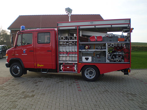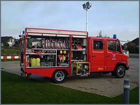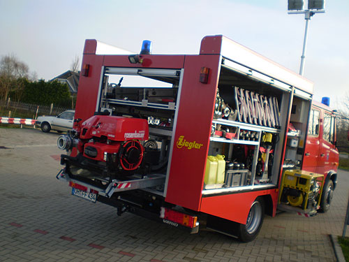 Neben der Normbeladung verfügt das Fahrzeug über einen 800 Ltr. Wassertank, der zusammen mit der Schnellangriffseinrichtung z.B. bei einem Fahrzeugbrand eingesetzt wird. Weiterhin verfügt das Fahrzeug über eine Umfeldbeleuchtung, die wie der Name schon sagt, das Umfeld ausleuchtet und den Kameraden beim Ent.- oder Beladen des Fahrzeugs während der Dunkelheit große Sicherheit gibt.
