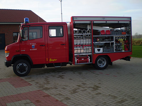 29.Nov.2008 Das TSF-W löst das 25 Jahre alte TSF Fahrzeug ab, welches noch von der Curauer Patenwehr in Pritzwalk in MVP genutzt wird. Das Fahrgestell des neuen Fahrzeugs ist ein handelsübliches Mercedes Vario 816 D 7,49 t.. Der Aufbau wurde bei der Fa. Ziegler Feuerwehrausrüster in Rendsburg nach den Bedürfnissen der FF Dissau gebaut.