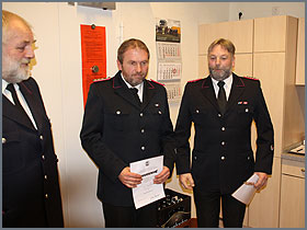 Unter Punkt 11 rief der OWF die Kam. Sven Bender, Thomas Wehde. u. Wilhelm Kamerichs zu sich, um anschl. Sven Bender für 10 Jährige Dienstzeit mit einer Spange, Thomas Wehde für 25 jährige Dienstzeit mit einem Windlicht und das Ehrenmitglied Wilhelm Kamerichs für 50 Jährige Zugehörigkeit mit einem Präsentkorb zu ehren. Der Wehrführer hatte auch für jeden Kameraden Eine kleine Laudatio parat.